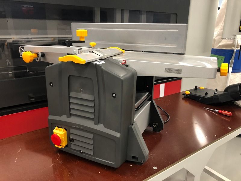 ФУГОВАЛЬНЫЙ УЗЕЛ Величина съема на фуговальном узле отслеживается по шкале. Фуговальный узел снабжен защитой для безопасности оператора. ПРИВОД СТРОГАЛЬНОГО ВАЛА Привод строгального вала реализован через ременную передачу, что обеспечивает сохранность электродвигателя. Привод подающего и принимающего роликов на рейсмусовом узле, выполнен через цепную передачу, что обеспечивает постоянную скорость движения заготовки и соблюдение режимов резания древесины. РЕЙСМУСОВЫЙ СТОЛ Перемещается на четырех винтовых опорах, имеет дополнительную поддержку заготовки, которая позволяет избежать подрыва на выходе из зоны строгания. КОГТЕВАЯ ЗАЩИТА Рейсмусовый узел снабжен когтевой защитой, которая предотвращает выброс заготовки. МИЛЛИМЕТРОВАЯ ШКАЛА Рейсмусовый узел снабжен миллиметровой шкалой с указателем толщины обработки. ЗАЩИТНЫЙ КОЖУХ Для отведения стружки и безопасности оператора, станок оснащен защитным кожухом. Если кожух не установить станок не включится. Краткие характеристики Максимальная ширина строгания, мм 210 Толщина строгания, мм 5 - 120 Максимальная величина съема: Фуговальный узел, мм 0 - 3 Рейсмусовый узел, мм 0 - 2 Скорость подачи на рейсмусовом узле, м/мин 8 Габариты столов: Фуговальный, мм 740 x 210 Рейсмусовый, мм 270 x 204 Размеры ножей, мм 210 x 16,5 x 1,5 Количество ножей, шт. 2 Частота вращения, об/мин 9000 Мощность, кВт 1,5 Габаритные размеры в упаковке: Длина, мм 850 Ширина, мм 460 Высота, мм 425 Вес брутто, кг 30 Габаритные размеры: Длина, мм 808 Ширина, мм 442 Высота, мм 464 Вес нетто, кг 27,4