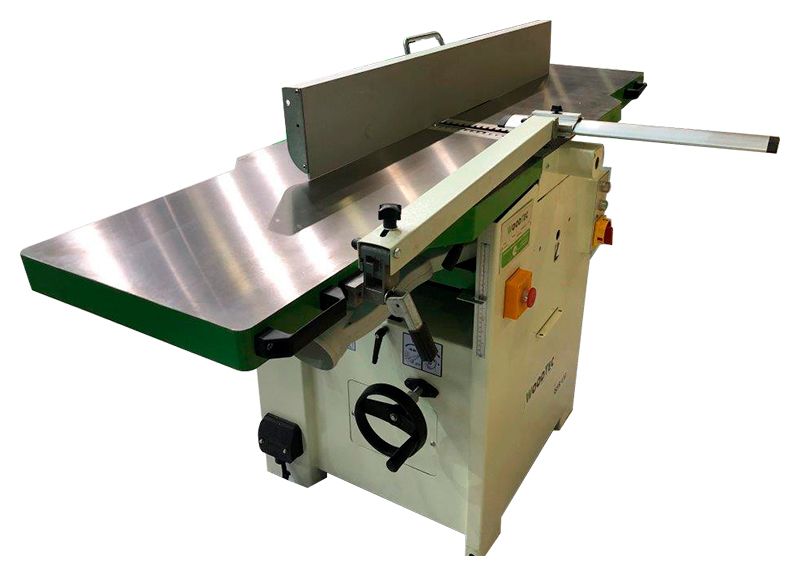 Назначение Предназначен для прямолинейного одностороннего строгания пласти и кромок заготовок с целью получения базовой поверхности для дальнейшей обработки, а также для строгания заготовок в размер по толщине. Область применения Предприятия и цеха по производству столярно-строительных изделий, клееных щитов, производству мебели и другие деревообрабатывающие производства. Схема обработки Конструктивные особенности ЛИТАЯ КОНСТРУКЦИЯ ФУГОВАЛЬНЫХ И РЕЙСМУСОВОГО СТОЛОВ Столы отлиты из серого чугуна, усиленные ребрами жесткости. Столы станка проходят обязательную шлифовку, на промышленных станках с ЧПУ. Такой подход к изготовлению гарантирует идеальную плоскость и долговечность конструкции, что обеспечивает идеальную геометрию строганной заготовки. ФУГОВАЛЬНЫЙ УЗЕЛ Снабжен профессиональной упорной линейкой (которая крепится к торцу подающего стола) и дает возможность устанавливать станок возле стены, тем самым не теряя площадь в цеху. Защита фуговального вала, обеспечивает безопасность в работе оператора. НАСТРОЙКА ПОЛОЖЕНИЯ ПОДАЮЩЕГО СТОЛА Осущевствляется винтовой передачей, это гарантирует постоянство выставленного размера, даже при перестройке станка с режима фугования на рейсмусование. УПОРНАЯ ЛИНЕЙКА Снабжена градуированной шкалой, которая позволяет установить требуемый угол наклона от 0° до 45°. И жестко фиксировать его эксцентриковым механизмом. Так же имеется механизм тонкой настройки положения фуговального упора. МЕХАНИЗМ ОТКИДЫВАНИЯ СТОЛОВ Столы откидываются поочередно, и базируются на специальных упорах, которые предотвращают повреждение станины станка. Принимающий фуговальный стол снабжен механизмом стопорения. СТРОГАЛЬНЫЙ УЗЕЛ Трехножевой строгальный вал, обеспечивает идеальное качество строгания, снабжен когтевой защитой и металлическим подающим валом. Строгальные и падающие валы закреплены в массивном стальном корпусе, который эффективно гасит ударные нагрузки, возникающие в процессе работы. РЕЙСМУСОВЫЙ УЗЕЛ Имеет одноопорную конструкцию и фиксирующую планку на входе с дополнительным винтовым зажимом, это обеспечивает неизменность положеняе стола в процессе работы. Величина глубины строгания отслеживается по шкале. АСПИРАЦИОННЫЕ КОЖУХИ В комплекте со станком поставляются два аспирационных кожуха: 1) Изначально установлен на рейсмусовом узле. 2) Необходимо установить под подающим фуговальным столом. Данное решение существенно экономит рабочее время при переходе с операции фугования на операцию рейсмусования. Краткие характеристики Максимальная ширина фугования, мм 410 Максимальная толщина снимаемого слоя, мм 4 Максимальная ширина рейсмусования, мм 408 Габариты фуговальных столов (длинах x ширина), мм 1809 x 510 Размер рейсмусового стола, мм 600 x 308 Толщина рейсмусования, мм 5 - 230 Скорость подачи при рейсмусовании, м/мин 7 Диаметр шпинделея, мм 72 Размер ножей, мм 410 x 30 x 3 Количество ножей, шт. 3 Частота вращения, об/мин 5200 Мощность, кВт 3 Габаритные размеры: Длина, мм 2010 Ширина, мм 727 Высота, мм 1087 Вес, кг 434 -