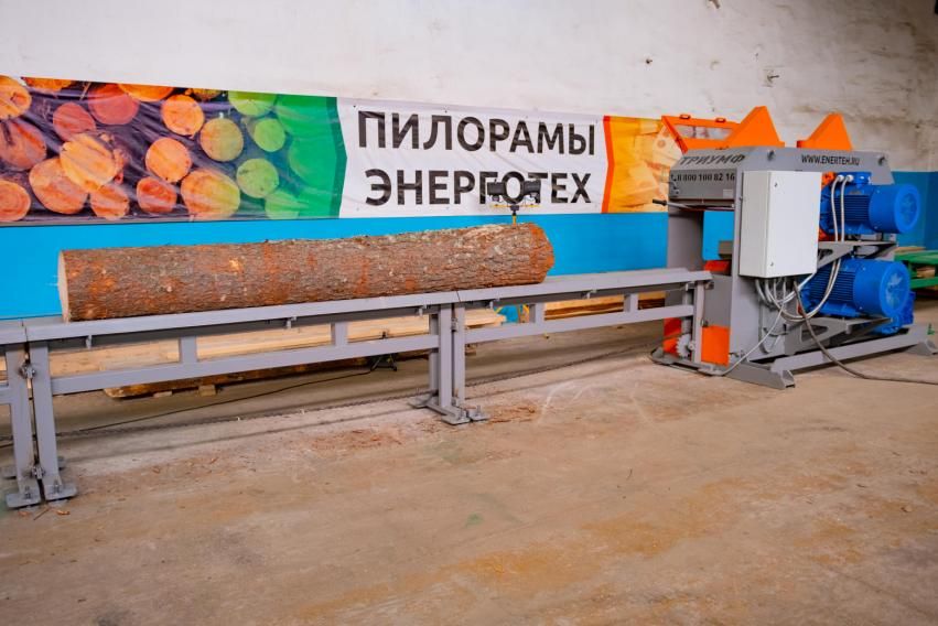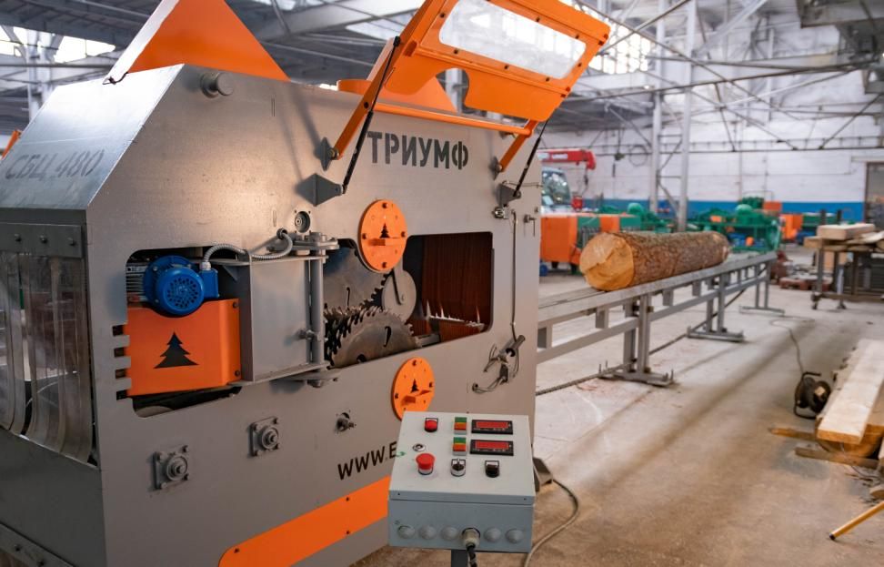 Промышленный брусовальный станок Триумф 16П480/ Двухвальный бревнопильный станок «Триумф-СБЦ480» предназначен для распиловки бревен диаметром до 450 мм для получения лафета и бруса. Размер между пилами устанавливается при помощи проставок. Бревно устанавливается по центру стола и при помощи цепной передачи передвигается в зону пиления. Для регулировки скорости подачи станок оснащен частотным преобразователем позволяющим изменять скорость от 0 до 22 м/мин. В электрошкафу предусмотрен термостат для поддержания рабочей температуры. На станке предусмотрен выносной пульт управления в базовой комплектации.