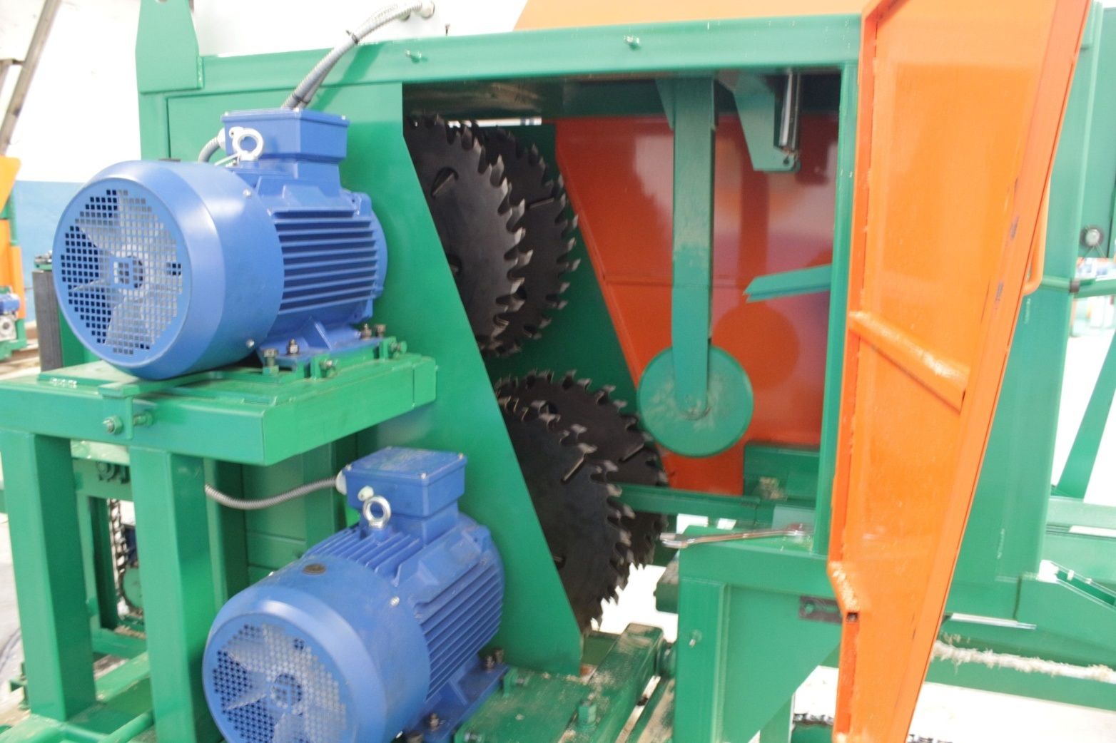 Промышленный брусовальный станок Триумф Т450 (2*22 и 2*30 кВт)/ Двухвальный бревнопильный станок «Тополь-450М» предназначен для распиловки бревен диаметром до 440 мм для получения лафета и бруса. Размер между пилами устанавливается при помощи винтовой пары вручную и фиксируется прижимными гайками. Бревно устанавливается по центру стола и при помощи цепной передачи передвигается в зону пиления. Для регулировки скорости подачи брусующий станок оснащен частотным преобразователем позволяющим изменять скорость от 0 до 16 м/мин. Высокая производительность-до 120 кубических метров в смену.