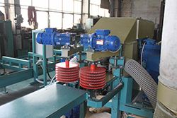 Фрезерно-брусующий блок состоит из двух электродвигателей мощностью 15 кВт каждый, смонтированных на линейных направляющих. На валах двигателей установлены комбинированные фрезы, включающие в себя барабан с бланкетными ножами и дисковую пилу. Конструкция фрез позволяет фиксировать их на валу двигателя в заданном положении, что обеспечивает изначально симметричное положение фрез относительно оси конвейера.