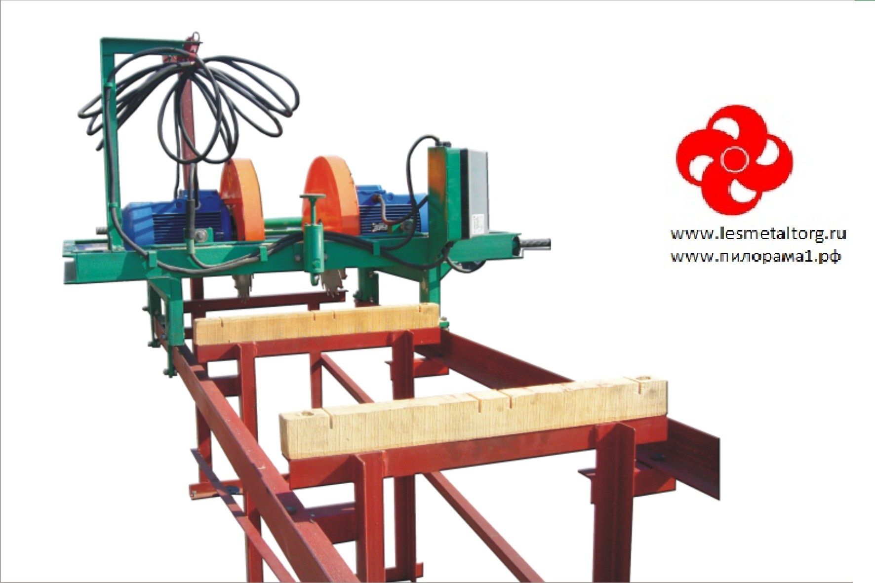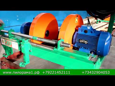 Кромкообрезной станок СКР-2 имеет два пильных диска диаметром 450 мм, с высотой пропила 50 мм. Пильные диски при помощи винтового механизма равномерно разводятся от центра пиления до нужной ширины доски. Кромкообрезной станок СКР-2 укомплектован двумя электродвигателями по 5.5 кВт каждый.