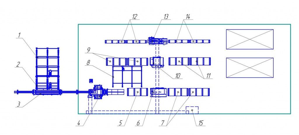 Помимо станков в линию включено околостаночное оборудование для облегчения ручного труда: накопитель и поштучная выдача бревен в бревнопильный станок, рольганги и поперечные транспортеры для перемещение досок и горбыля.