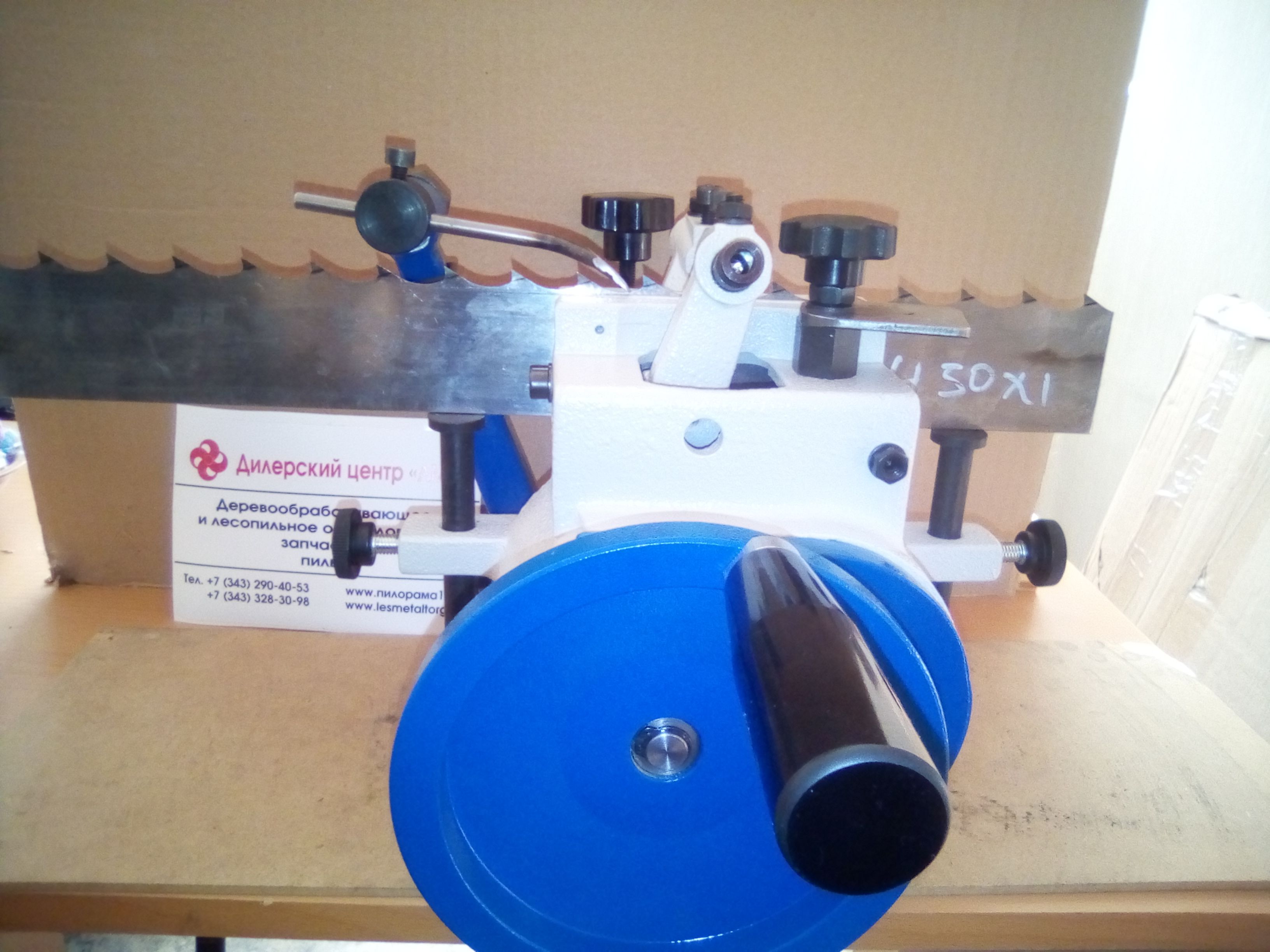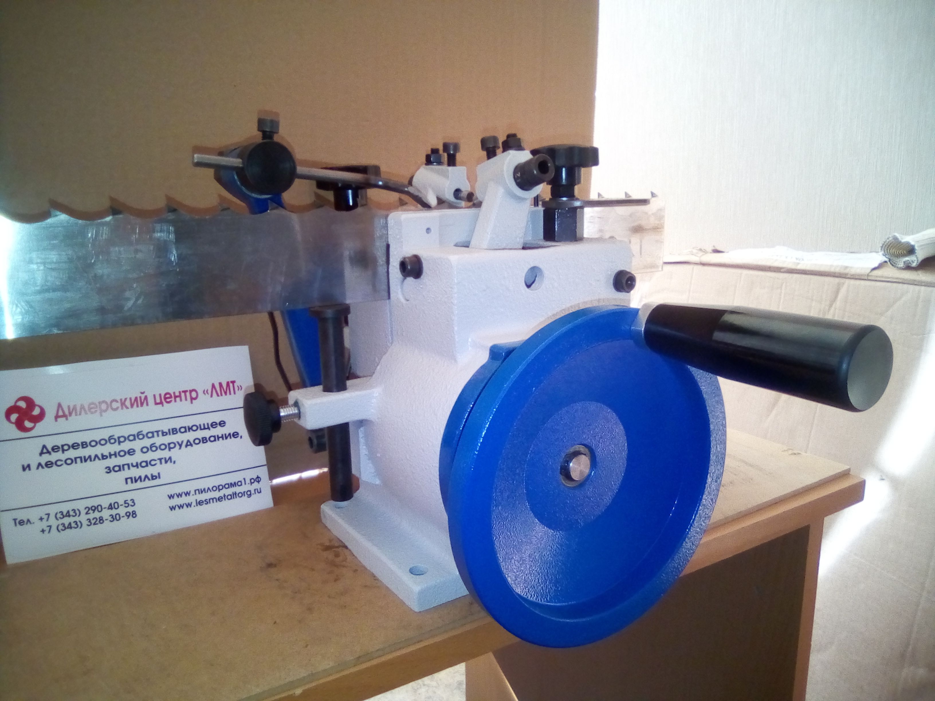 Станок работает в автоматическом режиме, производится одновременная разводка зубьев. Есть три варианта разводки зубьев: влево-вправо-прямо, вправо-лево-прямо, влево-вправо. Для приведения в работу станка нужно крутить ручку, как на мясорубке.