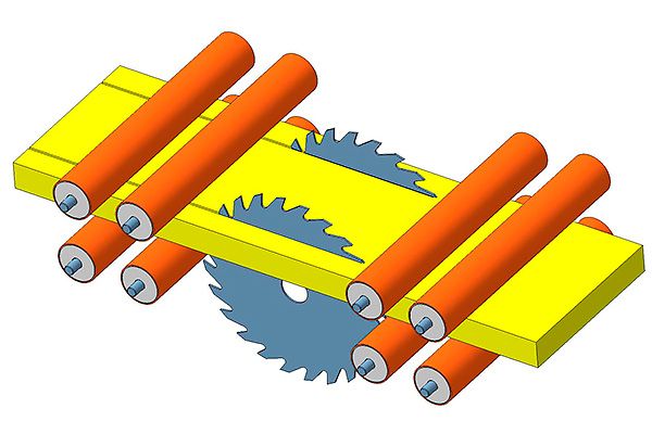 При распиловке на станке проходного типа КМ-350 заготовка движется через неподвижно установленный пильный узел. Использование механизма протяжки пиломатериала позволяет увеличить производительность производства.